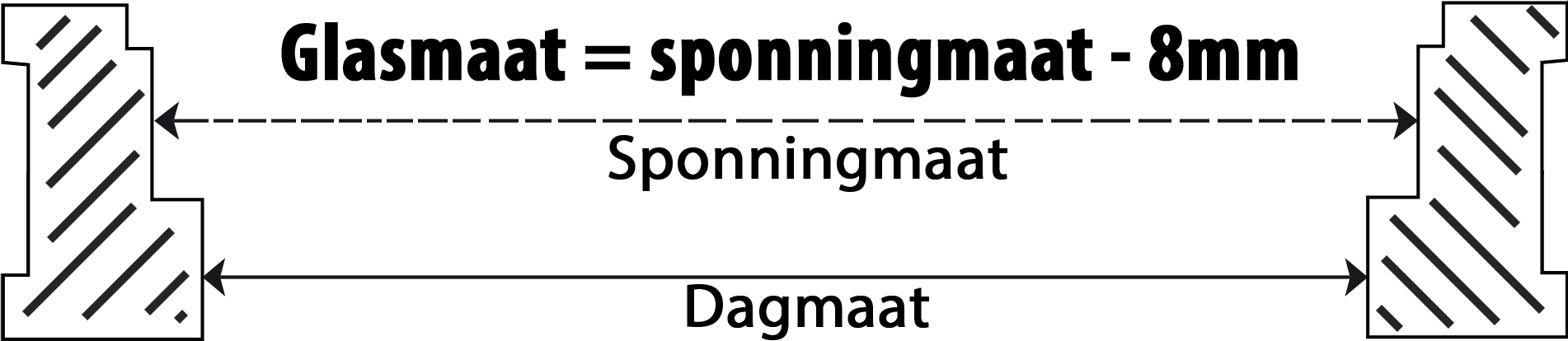 De sponningmaat is de strakke maat van het kozijn waar het glas in komt. Hier wordt een speling van 8 mm gebruikt. De 8 mm is benodigd voor de ventilatieruimte rondom de ruit en hier wordt dus meestal 4 mm per zijde voor genomen. Vandaar een aftrek van 8 mm horizontaal en 8mm verticaal.
